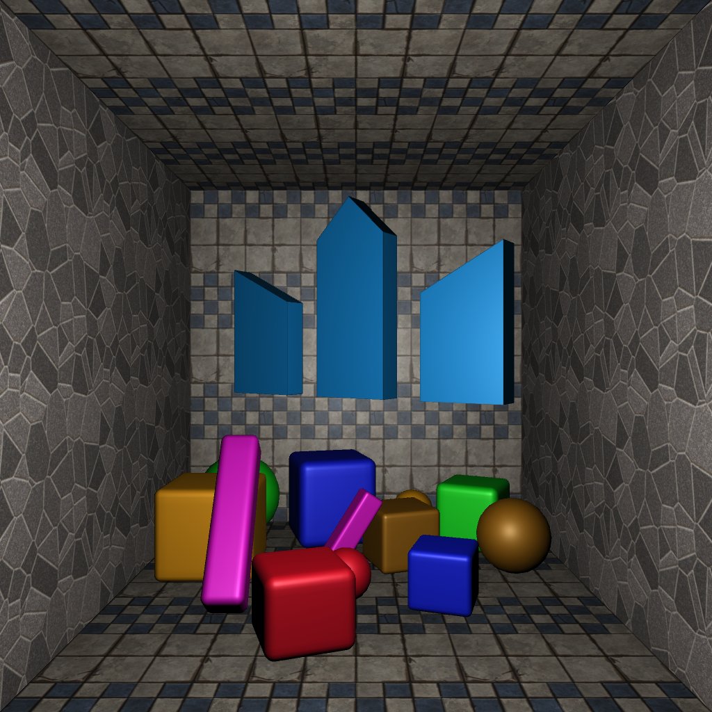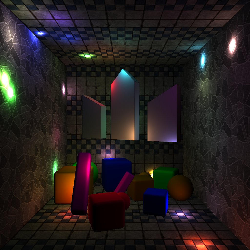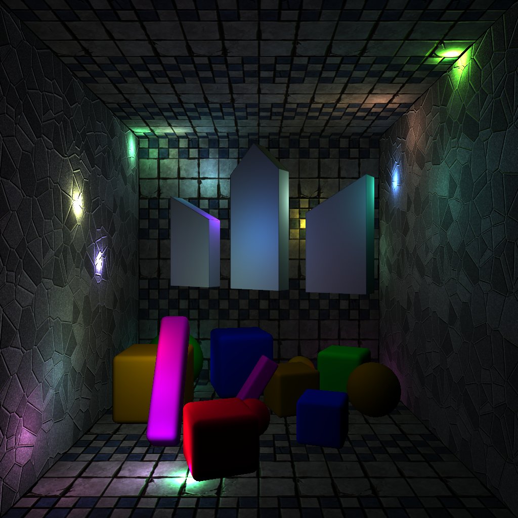 Исходная сцена представляет из себя комнату с кубиками и трёхмерным логотипом, освещённую стандартным шейдером Unity (по сути освещение по Фонгу).