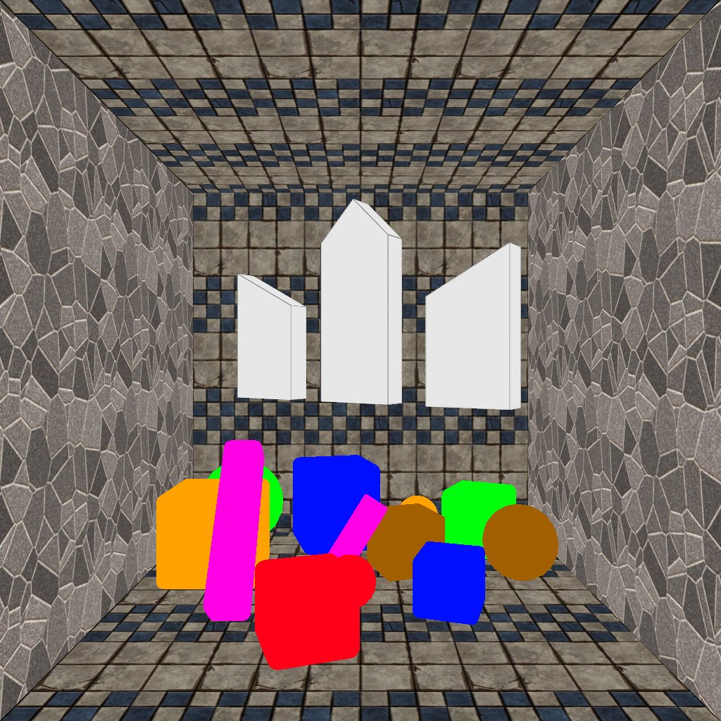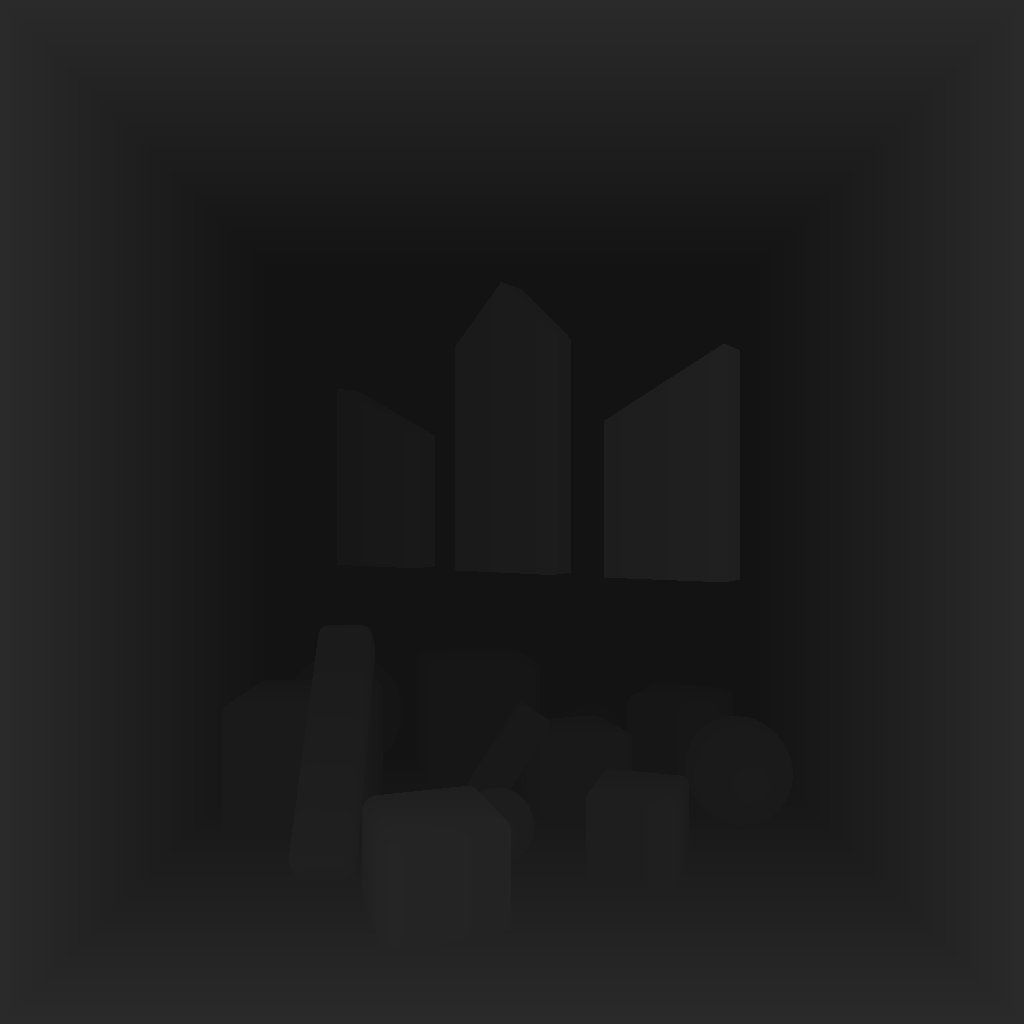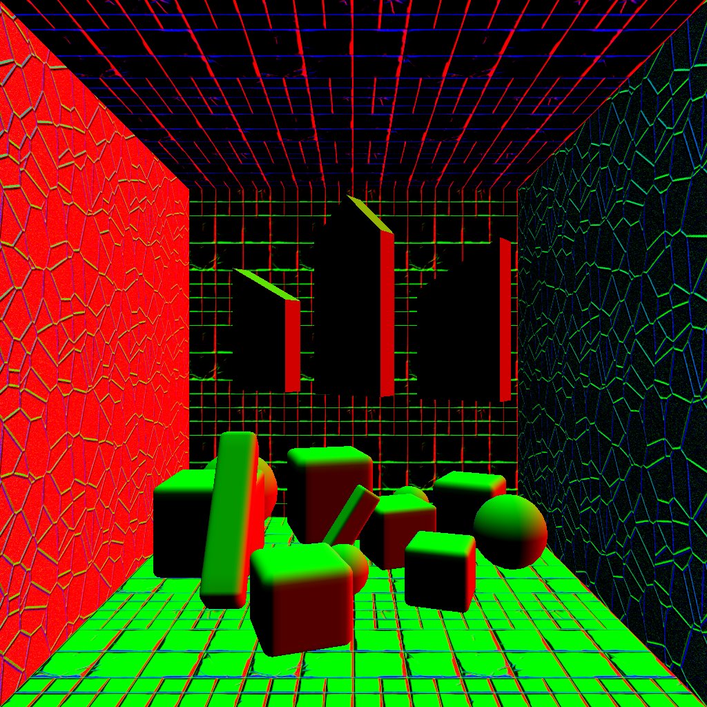 Исходная сцена представляет из себя комнату с кубиками и трёхмерным логотипом, освещённую стандартным шейдером Unity (по сути освещение по Фонгу).