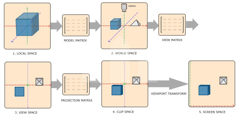 Поговорим о том, как строится 2D изображение из трёхмерной сцены. Как известно, точка в трёхмерном пространстве переводится сначала из локального пространства в пространство модели, затем в мировые координаты, и далее проектируется на двумерную плоскость. Схематически данный алгоритм можно представить в следующем виде:
