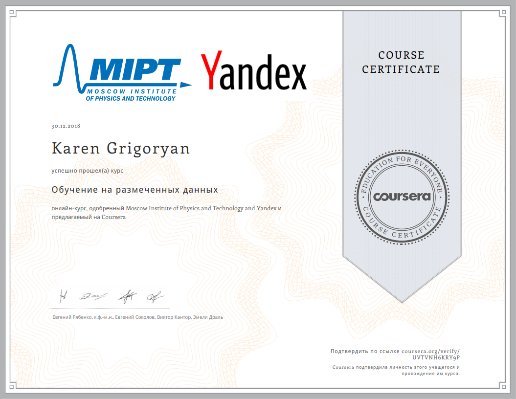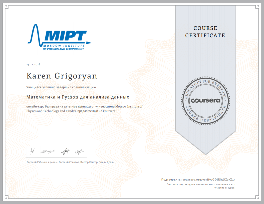 В данный момент времени меня заинтересовал анализ данных (data science), сейчас я прохожу цикл курсов от Яндекса и МФТИ по анализу данных.