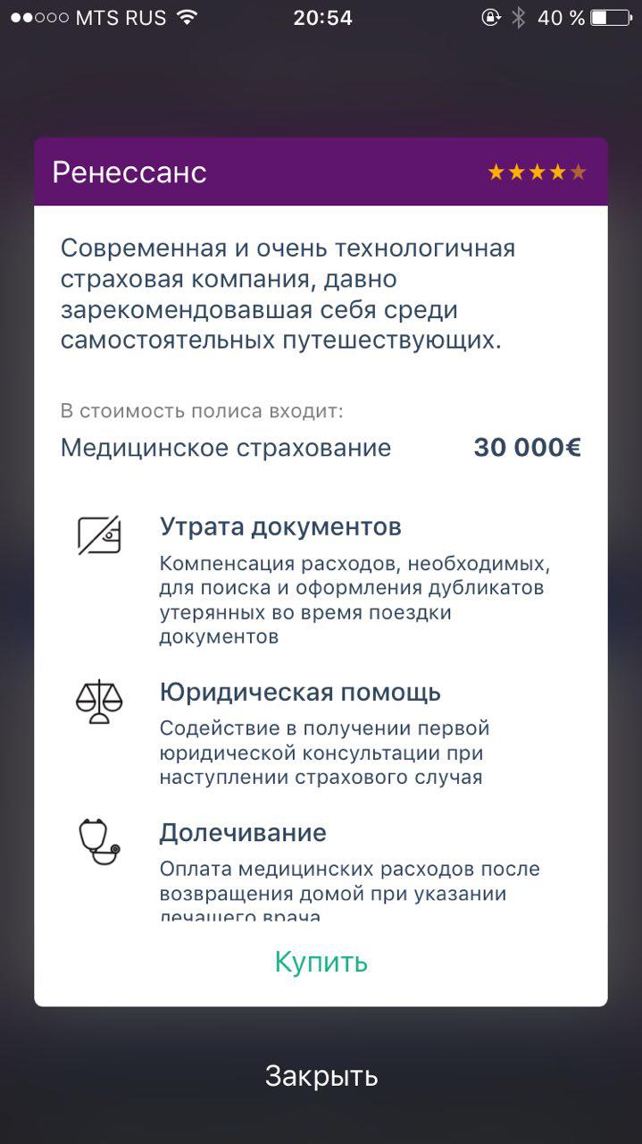 После выбора страхового полиса пользователь приложения указывает паспортные данные и оплачивает стоимость полиса, после чего скачивает уже оформленный полис к себе на телефон, и получает его копию на email.