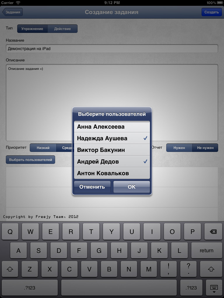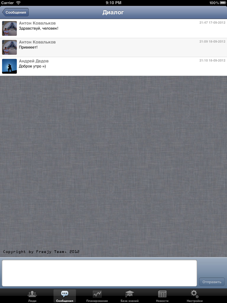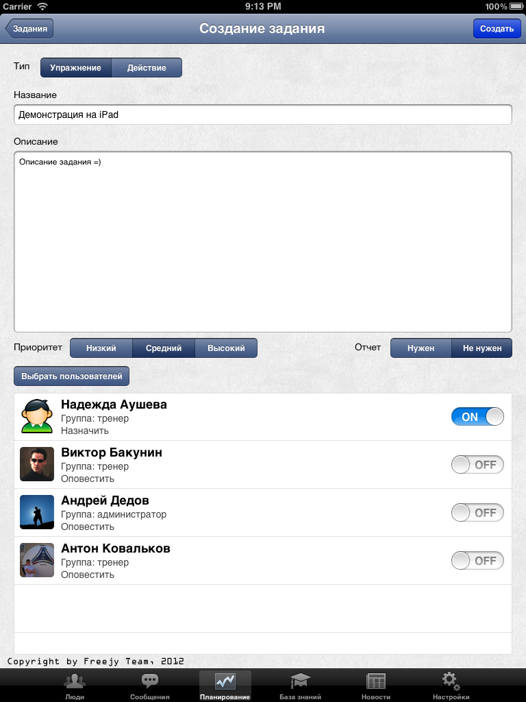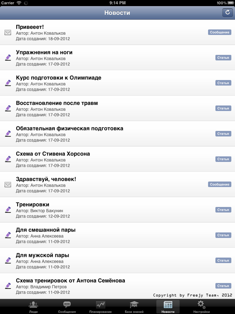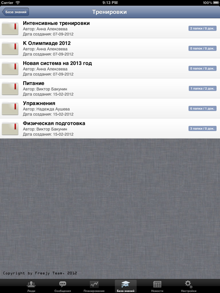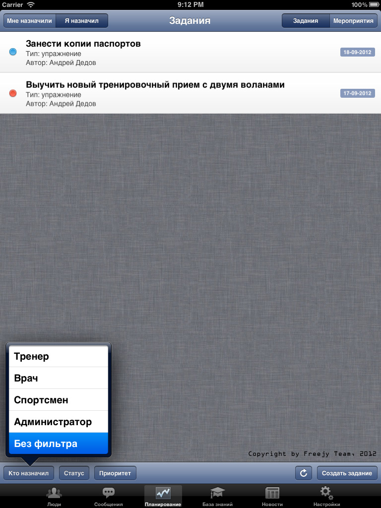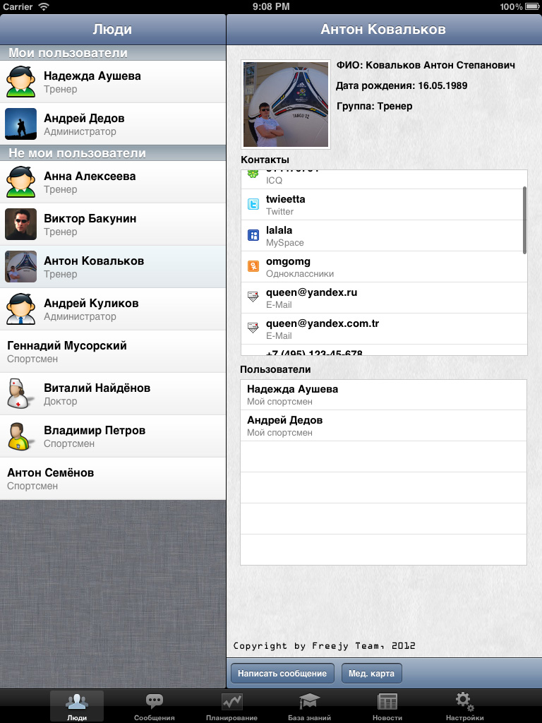 iOS приложение, разработанное совместно с самой соц. сетью, позволяет полноценно руководить спортивной федерацией: назначать тренировки, просматривать результаты тренировок и мед. карты спортсменов, вести документооборот, раздавать задания, составлять и просматривать календарь, переписываться с любыми сотрудниками федерации и многое другое.