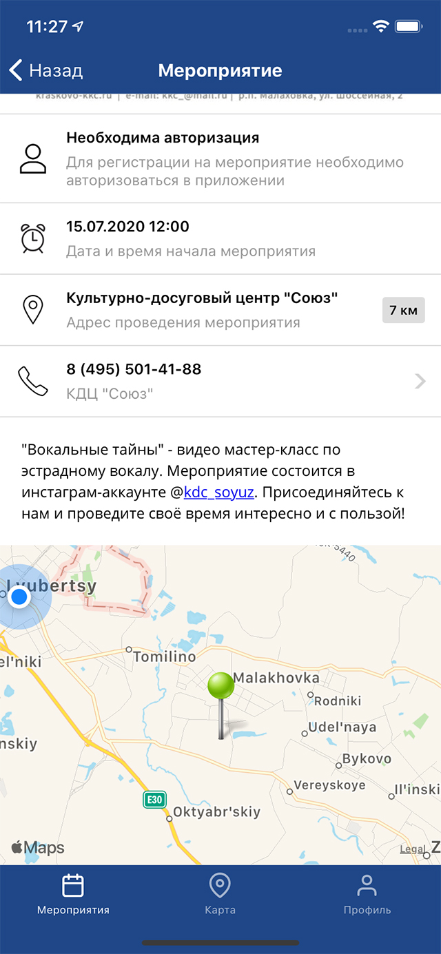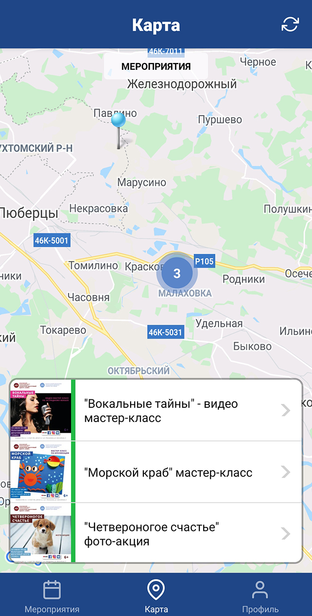 Мобильное приложение для соц. сети «Люберецкие звёзды». Позволяет просматривать список меропирятий (в виде списка и на карте), проходящих в ГО «Люберцы», регистрироваться на мероприятия, предупреждает о начале мероприятия.
