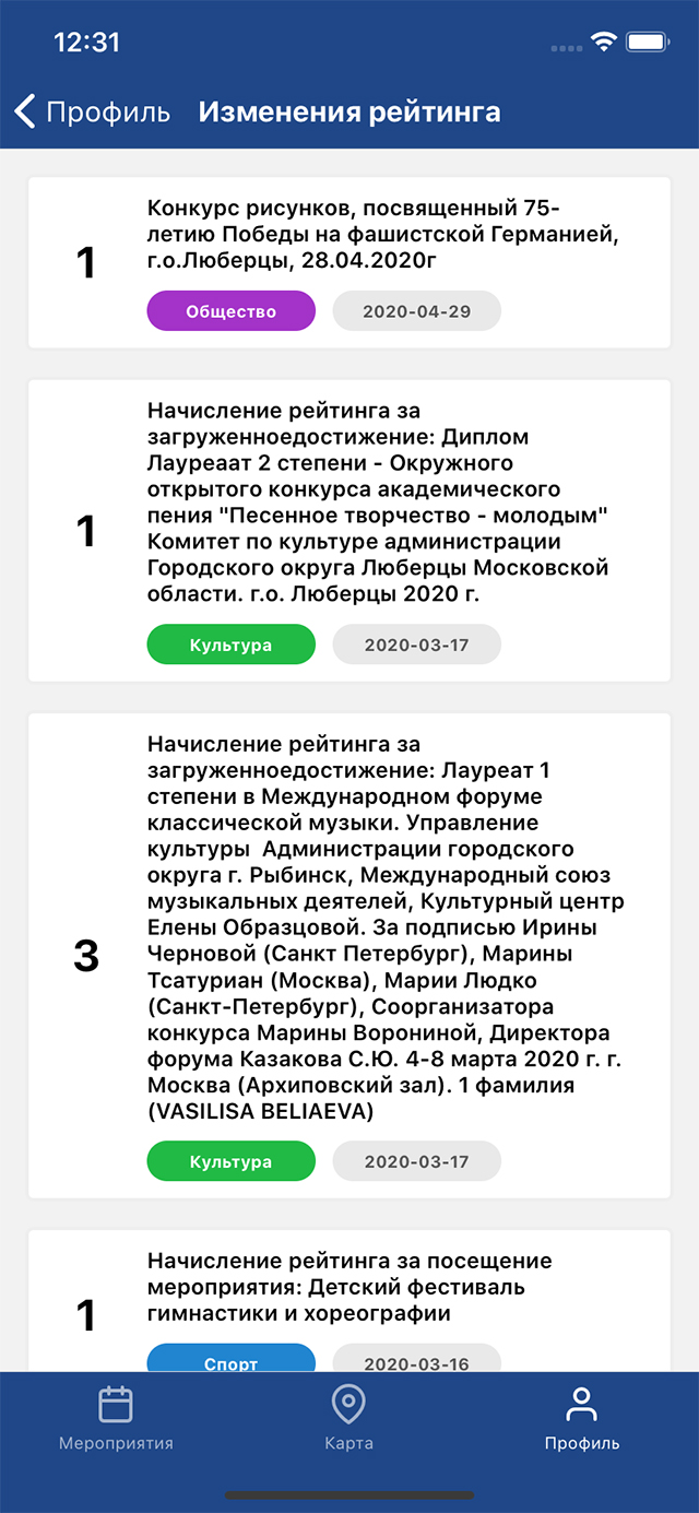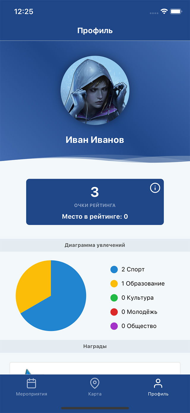 Кроме этого, приложение позволяет сообщить на сервер о посещении мероприятия сканированием QR кода во время проведения мероприятия. При посещении пользователем мероприятия ему автоматически начисляются бонусные баллы и награды, которые отображаются на странице профиля.