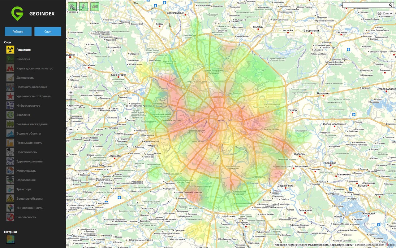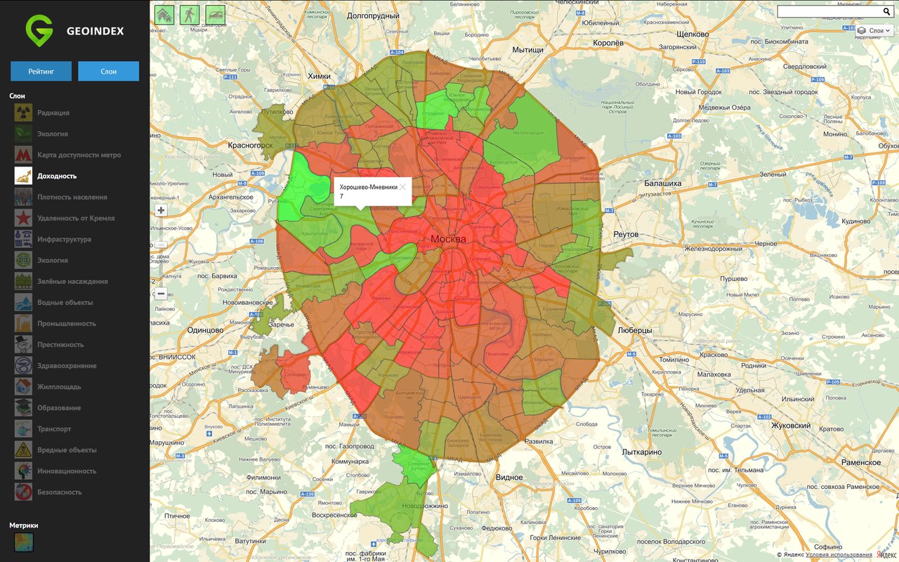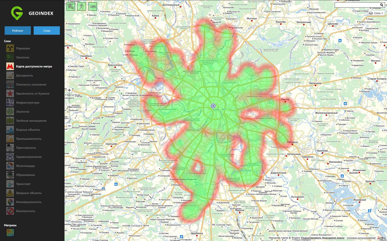 Геоинформационный сервис, позволяющий оценить выбранный дом по количеству и расстоянию до близлежащих объектов инфраструктуры (станций метро, больниц, школ, аптек и т.д.) и получить итоговую взвешенную оценку, показывающую насколько удобно и комфортно будет жить в выбранном пользователем доме (т.н. геоиндекс).