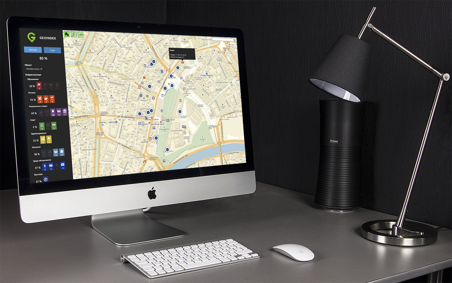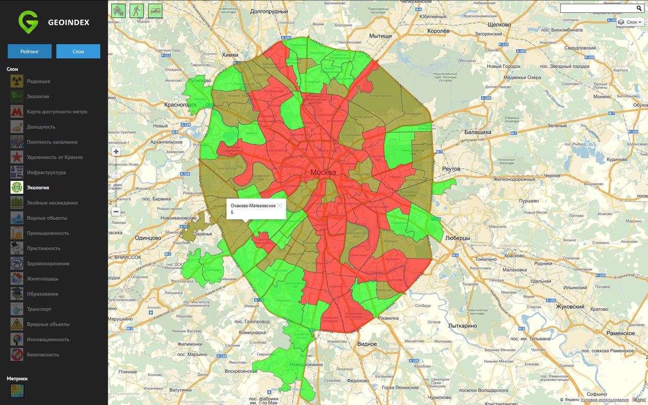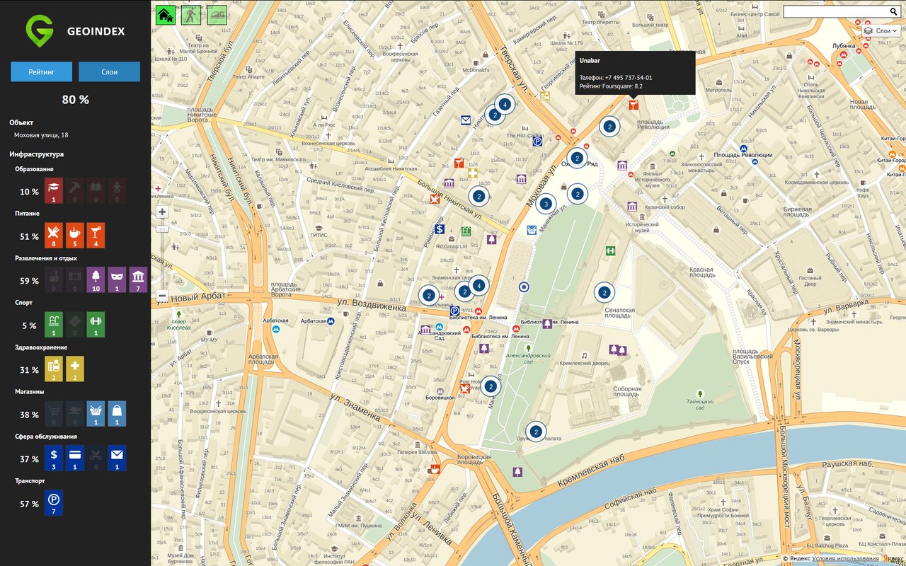 Геоинформационный сервис, позволяющий оценить выбранный дом по количеству и расстоянию до близлежащих объектов инфраструктуры (станций метро, больниц, школ, аптек и т.д.) и получить итоговую взвешенную оценку, показывающую насколько удобно и комфортно будет жить в выбранном пользователем доме (т.н. геоиндекс).